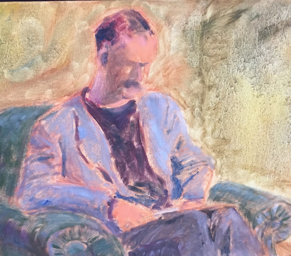 Rick Newby Reading (after Fra Dana), by Liz Gans, oil on board, 1999